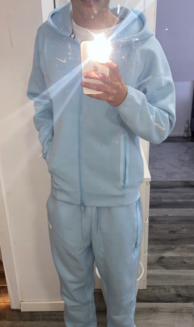 trägt unseren Babyblauen Nocta Anzug zum babyblauen Trackie